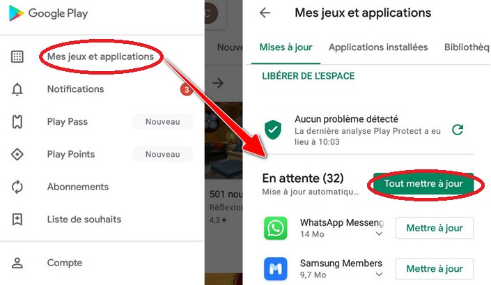 Il se peut que le problème soit causé par une version obsolète ou défectueuse de l’application Android. Dans ce cas, vous pouvez essayer de mettre à jour l’application vers la dernière version disponible, qui peut contenir des corrections de bugs ou des améliorations de performance. Pour mettre à jour une application Android, suivez ces étapes :