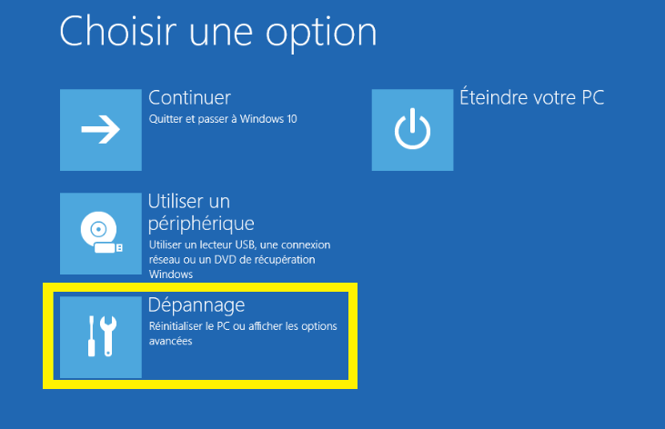 Au démarrage du PC : appuyez plusieurs fois sur la touche F8 ou F11 dès que vous voyez le logo du fabricant de votre PC. Si cela ne fonctionne pas, essayez d’interrompre le démarrage normal du PC en appuyant sur le bouton d’alimentation pendant environ 10 secondes pour l’éteindre.