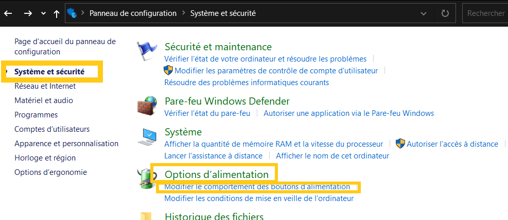 Dans le Panneau de configuration, cliquez sur « Système de sécurité » puis « Options d’alimentation » ou « Options d’énergie« , selon la version de Windows que vous utilisez.