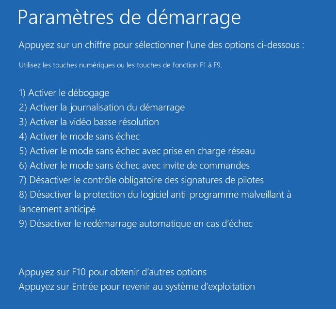 A l’écran des paramètres de démarrage, appuyez sur la touche 4 ou F4 pour activer le mode sans échec, ou sur la touche 5 ou F5 pour activer le mode sans échec avec prise en charge réseau.