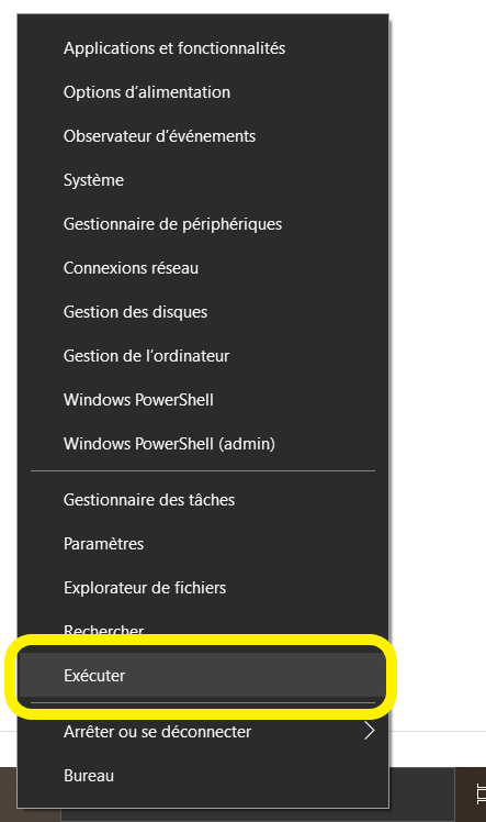 Faire un clic droit sur le bouton Démarrer en bas à gauche de votre écran, puis choisir Exécuter