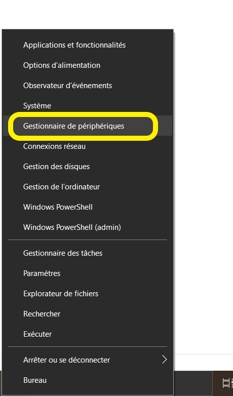 Pour y accéder : Faire un clic droit sur le bouton Démarrer en bas à gauche de votre écran, puis choisir Gestionnaire de périphériques.