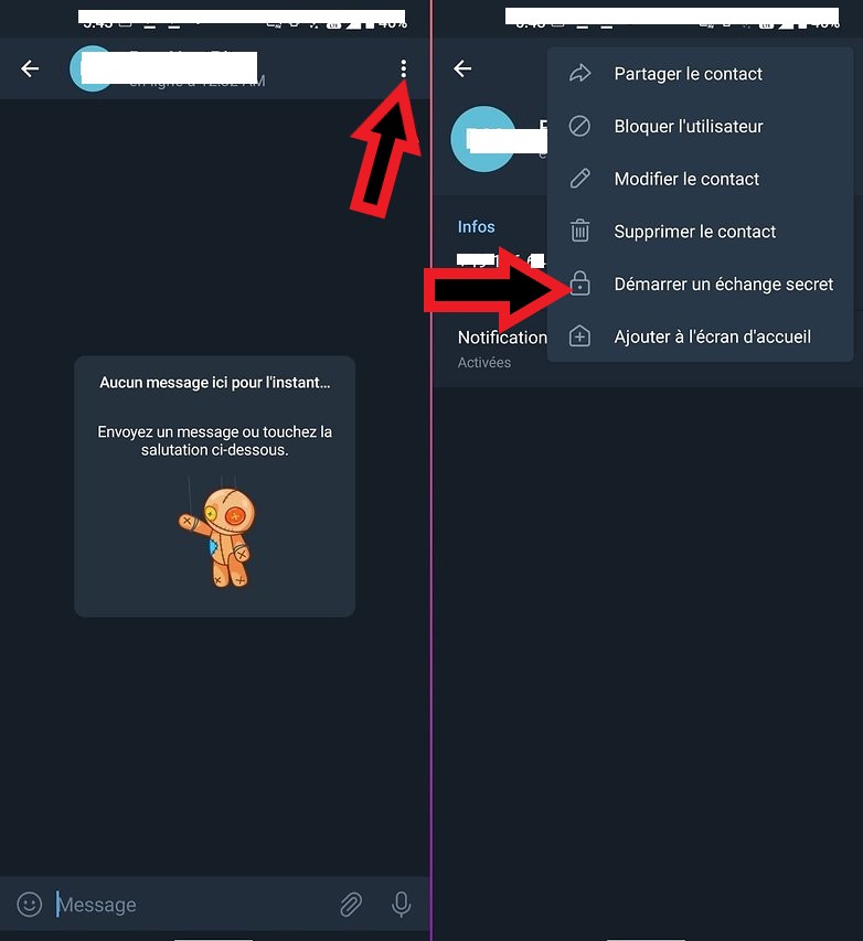 Pour démarrer un échange secret : ouvrez Telegram > importez vos contacts > choisissez un contact > appuyer sur les 3 petits points verticaux en haut à droite de la conversation > sélectionnez « démarrer un échange secret »