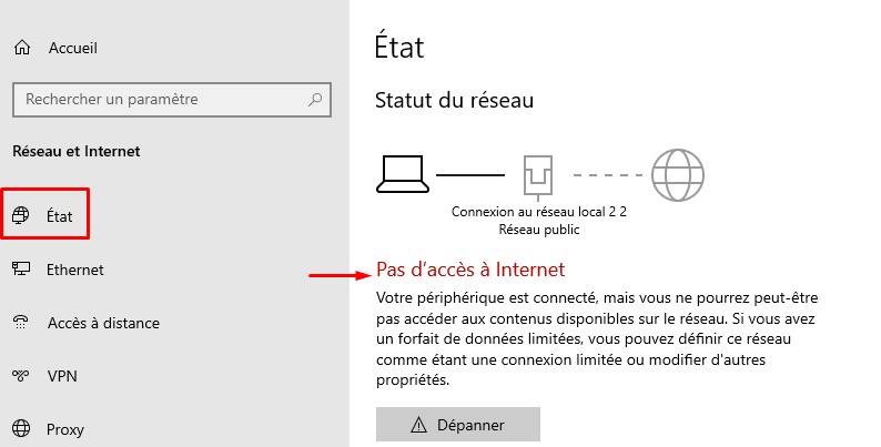 La deuxième chose à faire est de vérifier que vous êtes bien connecté à internet. Regardez l’icône dans le coin de votre écran pour voir si votre ordinateur indique une connexion stable. Si vous êtes en mode avion ou si le Wi-Fi est désactivé, c’est la cause du problème.