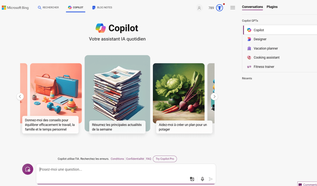 Par lui-même, Copilot fournit de nombreuses informations utiles, mais vous pouvez l’utiliser pour des demandes plus spécifiques via les GPTs. Sur le site web de Copilot, cliquez sur l’onglet Conversations en haut à droite.