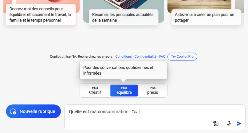 2 — Personnalisez le style de conversation de Copilot : Plus Créatif, Plus Précis ou Équilibré