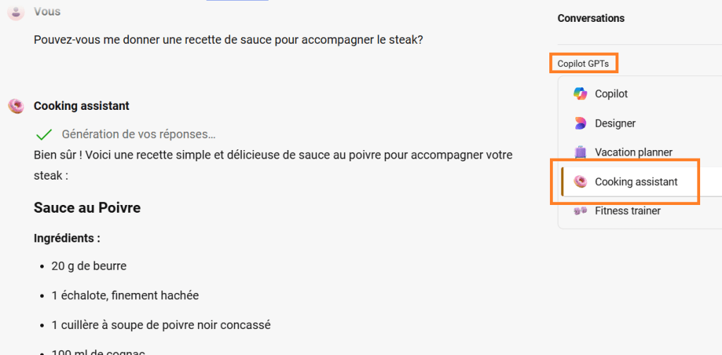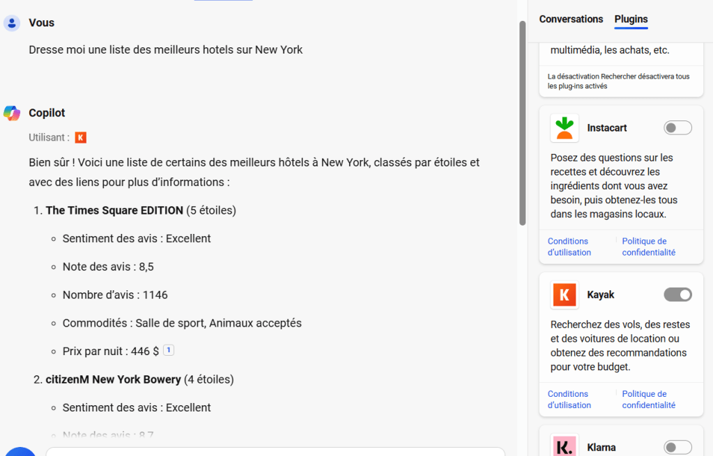 Après avoir sélectionné ceux que vous souhaitez utiliser, tapez votre question dans la partie conversation et Copilot utilisera l’un des plugins pour trouver et générer les informations nécessaires.