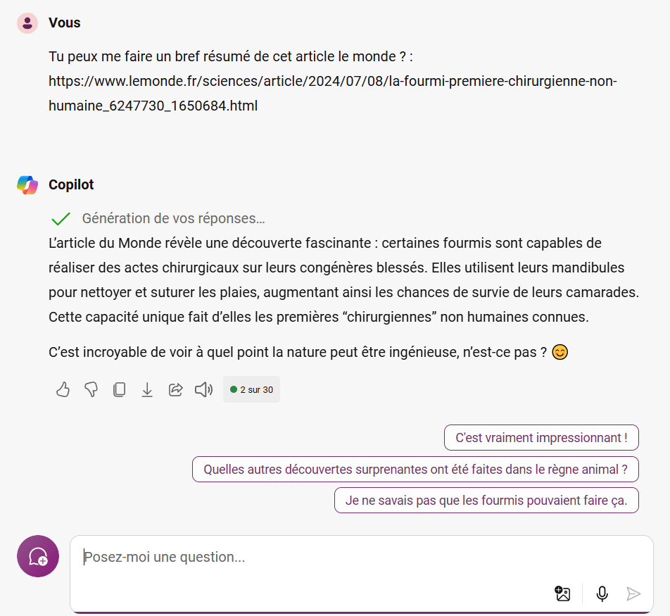 Vous pouvez également copier le lien d’un article et le coller dans le chat pour demander ensuite à Copilot d’en faire un résumé ou tout autre analyse, soyez créatif !