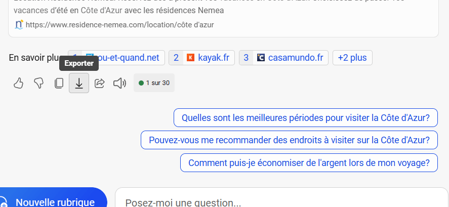 Pour poser une question différente sans rapport avec une demande précédente, cliquez sur le bouton bleu « Nouvelle Rubrique » et composez votre nouvelle question. Voici quelques suggestions pour tirer le meilleur parti de votre temps avec Copilot.